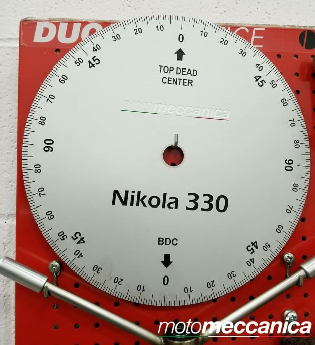 Да би измерили вредности у којим су узупчене брегасте, треба да намонтирамо разводни точак на једну страну радилице по могућности на страну где је алтенатор. Ако треба да се направи неки адаптер да би се разводни точак што боље и чвршће монтирао на радилицу – урадите то. Ако се у прорачуну погреши и више од 3 степена може да се деси оно најгоре и да клип “пољуби” вентил чим се агрегат загреје. Кад се намонтира разводни точак на радилицу морамо да причврстимо парче жице шрафом на блок мотора,а та жица ће нам служити као показивач при читању вредности на разводном точку. Компаратер мора да се монтира чврсто на главу агрегата јер ако се помера не може да се очита тачна вредност отварање и затварања вентила. Исто тако компаратер мора да буде у истој оси са вентилом јер ако је мало накривљем на лево или десно неће да нам очита праву вредност отварања и затварања. Ја волим да почнем са усисном брегастом и да користим један компаратер . Неки мајстори користе по два у исто време, да читају вредности усисне и издувне брегасте што убрзава процес.