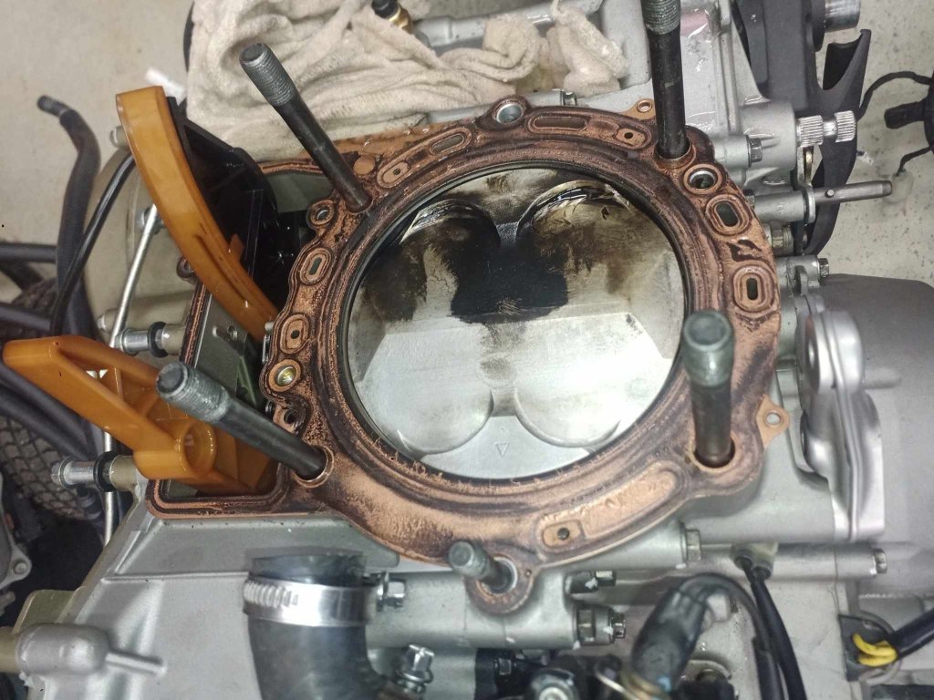 Као што видите горња слика је хоризонтални клип, а доња слика је вертикални клип који је окренту унутар стублине за 180 степени. Може да се види да су оба усисна вентила ударала у клип због тога. А коришћење бакарног спреја да се искористи стари дихтунг главе неби да коментаришем…